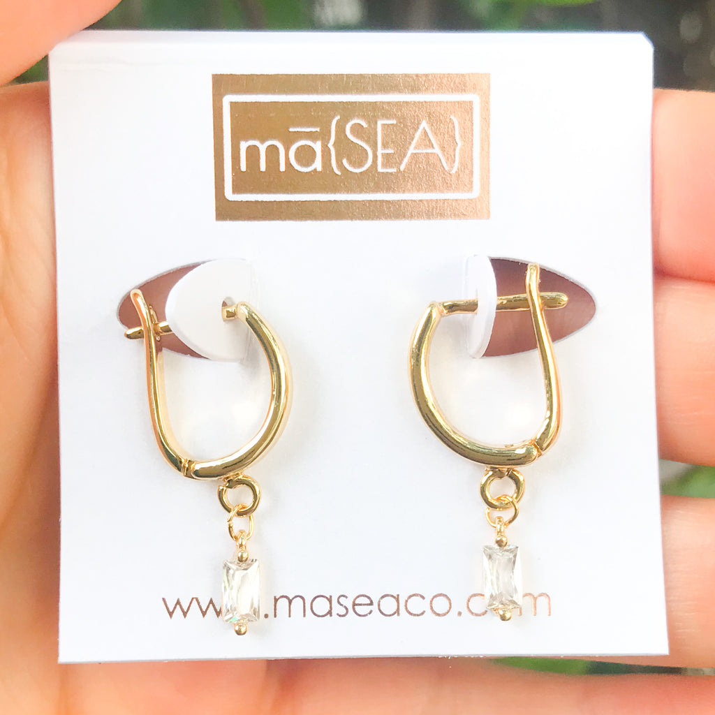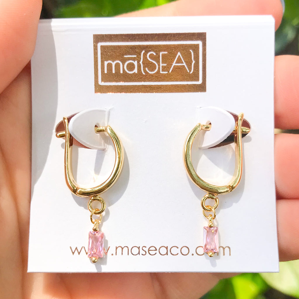 Baguette stone on gold huggie hoop finding. Stone colors are dark pink, red, clear, blue, green, light pink, purple, black, & aqua.