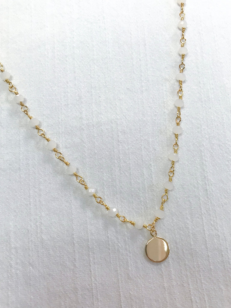 Gold circle coin tag pendant on your choice of color beaded gold rosary chain with 2inch extender.